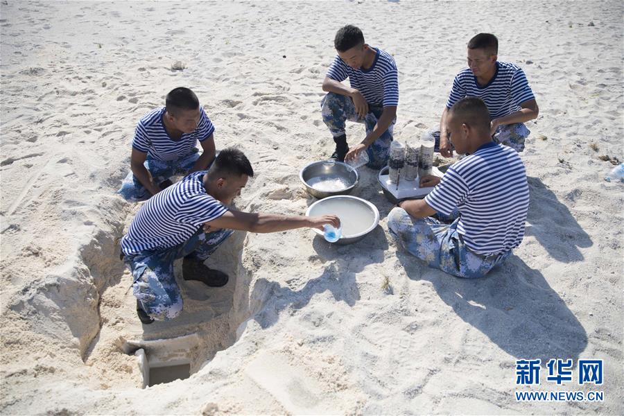 中建岛守备营官兵在野外生存训练中挖岛水过滤(5月22日摄)。 新华社记者 琚振华 摄