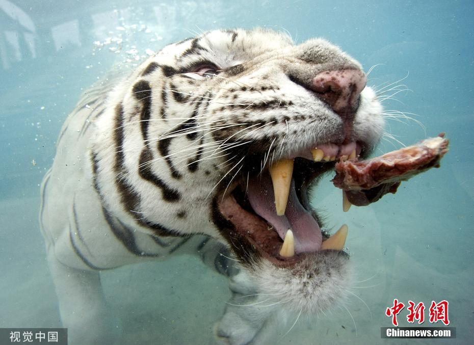 图为2009年7月23日,美国加利福尼亚州瓦里豪,动物园里的各种动物通过各种方式消暑。其中一只名为Odin的白色孟加拉虎不需要任何潜水设备就成功地潜入了水中。为了吃到水中的肉块,它还在水中大张着眼睛四处寻找。图片来源:视觉中国