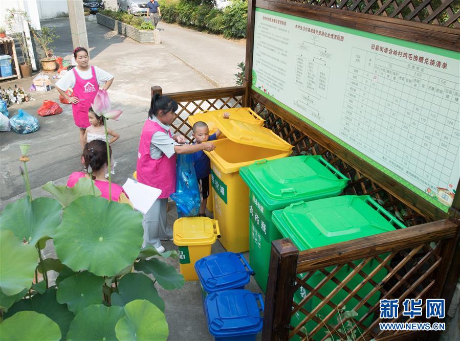 6月10日,志愿者在旧县街道合岭村“鸡毛换糖”垃圾回收点进行垃圾分类投放。 浙江省桐庐县旧县街道自2016年起推行“鸡毛换糖”垃圾分类模式,村民在指定地点投放生活垃圾可获得积分,并可用积分兑换生活用品、书籍等。目前,该模式已在旧县街道5个村实现全覆盖,促进了乡村环境的提升。 新华社记者 翁忻旸 摄