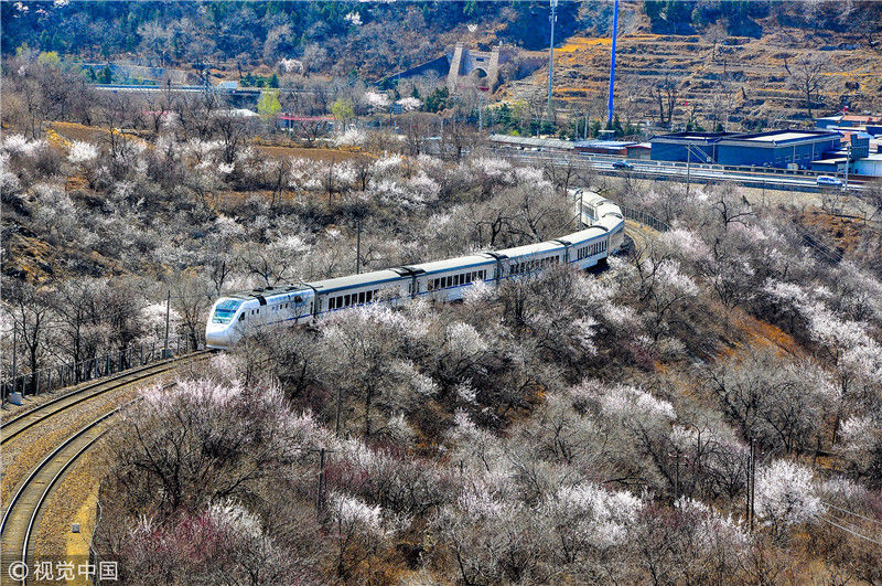 2019年3月22日,北京居庸关附近的山花盛开,S2线列车穿行在花海之中,构成一幅美丽的画面。