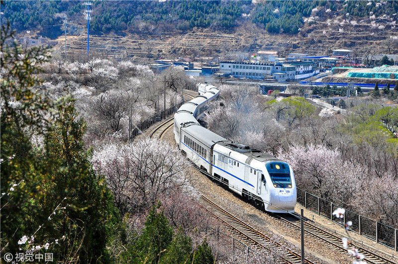 2019年3月22日,北京居庸关附近的山花盛开,S2线列车穿行在花海之中,构成一幅美丽的画面。
