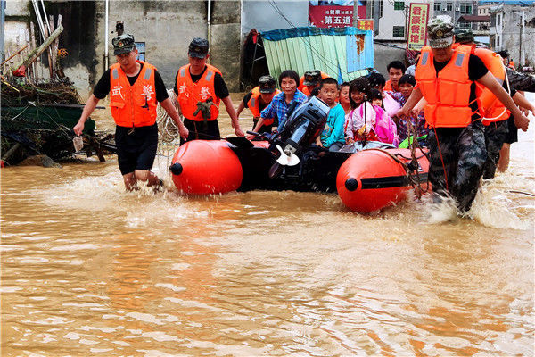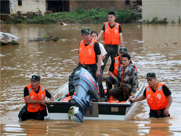 2019年6月10日,广东河源,武警河源支队官兵在抗洪一线转移被困群众。