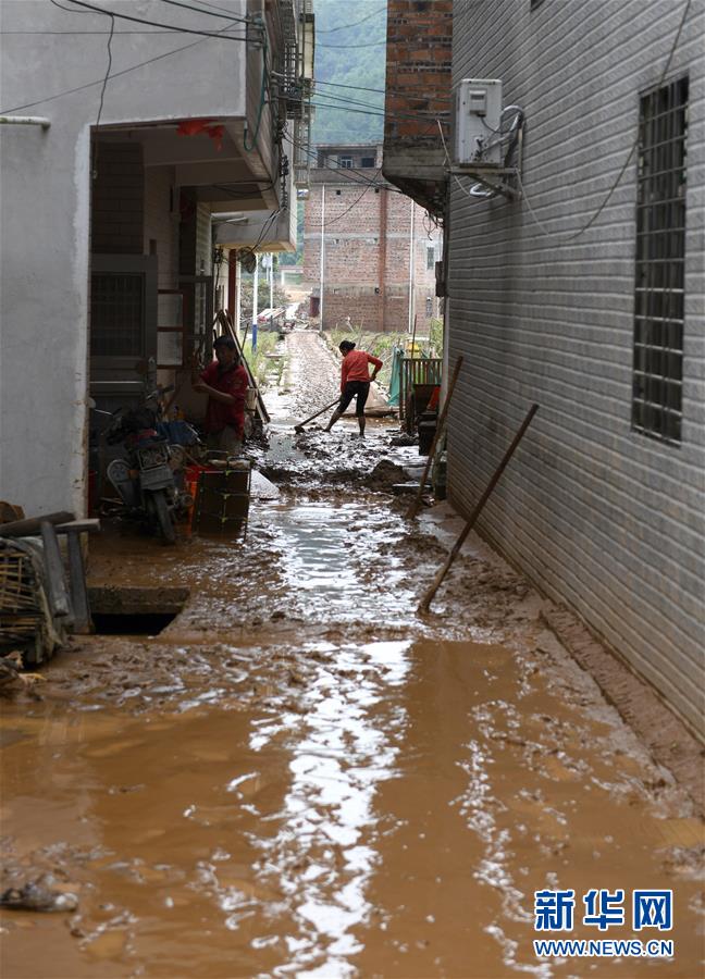 6月11日,在广东省河源市连平县上坪镇下洞村,村民清理淤泥。新华社记者卢汉欣摄