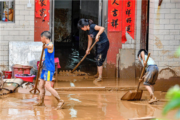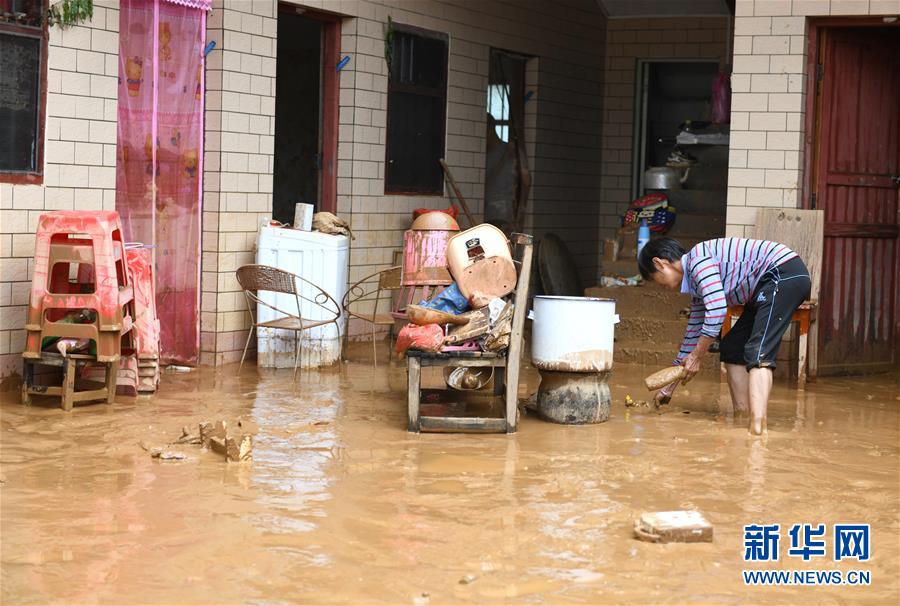 6月11日,在广东省河源市连平县上坪镇下洞村,村民清理院子里的淤泥。新华社记者卢汉欣摄