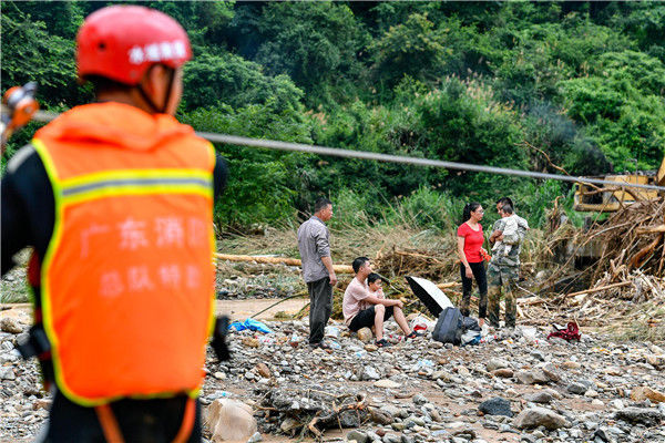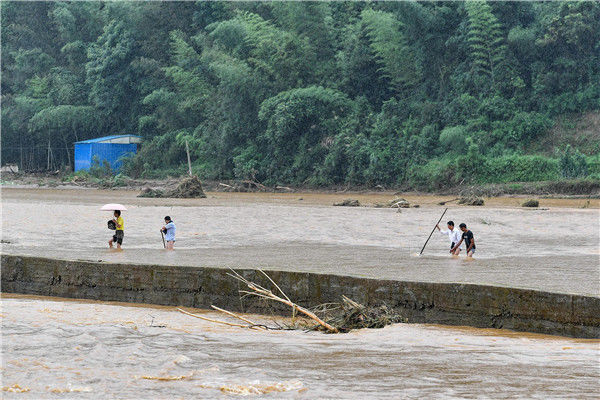 2019年6月11日,广东省河源市连平县上坪镇居民涉水过河。据广东省河源市防汛防旱防风指挥部办公室统计,截至6月11日,暴雨导致河源全市63个乡镇不同程度受灾,因灾死亡7人,失联1人,受伤3人,受灾人口11.455万人,倒塌房屋956间,转移人口1.454万人。 其中,连平县部分乡镇受灾较严重,因灾死亡6人(4女2男),直接经济损失约1.5亿元人民币。