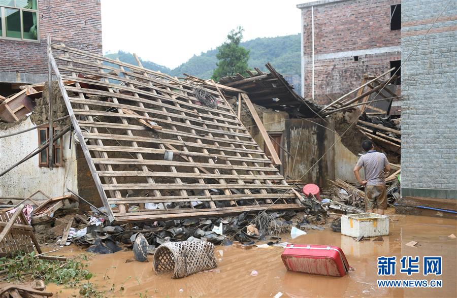 6月11日,在广东省河源市连平县上坪镇下洞村,村民查看受损的房屋。新华社记者卢汉欣摄