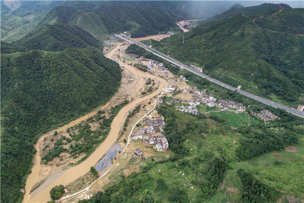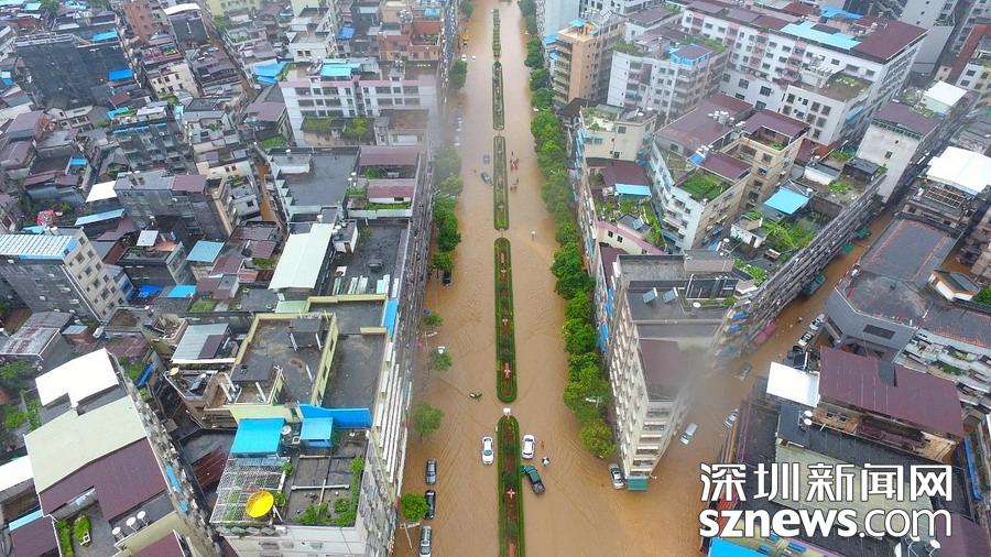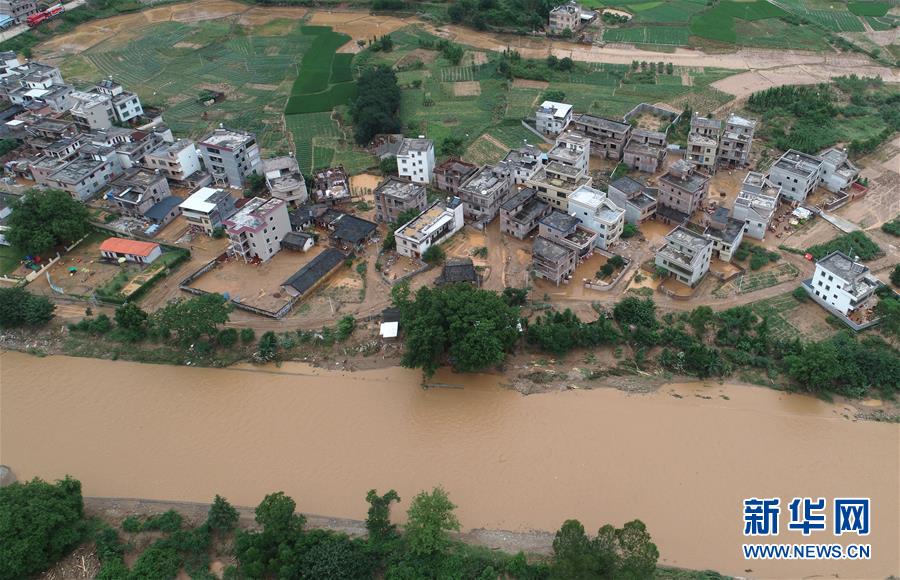 2019年6月11日,据广东省河源市防汛防旱防风指挥部办公室统计,截至6月11日,暴雨导致河源全市63个乡镇不同程度受灾,因灾死亡7人,失联1人,受伤3人,受灾人口11.455万人,倒塌房屋956间,转移人口1.454万人。 其中,连平县部分乡镇受灾较严重,因灾死亡6人(4女2男),直接经济损失约1.5亿元人民币。 图为航拍镜头下的广东省河源市连平县上坪镇。来源:陈骥旻(广东分社)/中新社/视觉中国
