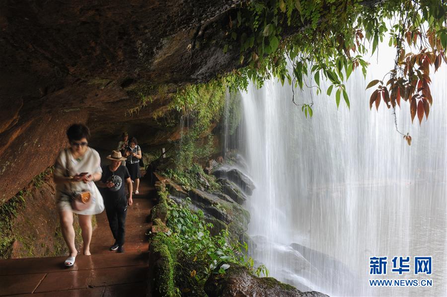 6月5日,游人在贵州赤水丹霞旅游区“美人梳”瀑布游览。 贵州遵义赤水市有众多大大小小的瀑布群,素有“千瀑之市”的美誉,飞瀑美景吸引八方游客前来赏景度假。 新华社记者郑雅宁摄