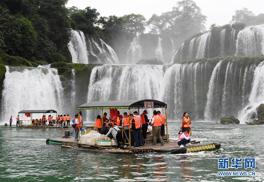 4月17日,游客在大新县德天瀑布景区游览。