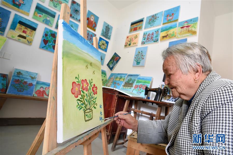龙潭村83岁老人张秀娇在自己的画作上签名(6月12日摄)。在龙潭村“人人都是艺术家”文创项目的带动下,张秀娇老人于2018年拿起画笔学习油画。新华社记者 姜克红 摄