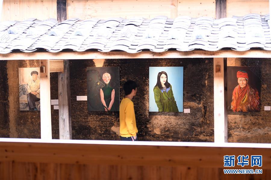 一名参观者在“龙潭美术馆”观赏龙潭村民的油画作品(6月12日摄)。 新华社记者 林善传 摄