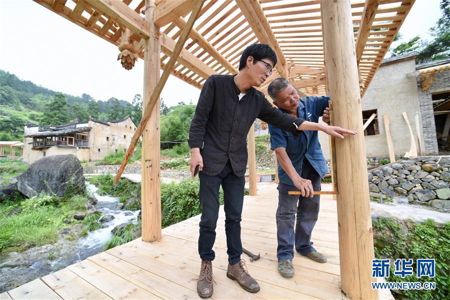 屏南县古村落文化创意产业项目发展总策划林正禄(左)在龙潭村与施工人员探讨新建廊桥施工方案(6月12日摄)。 新华社记者 姜克红 摄