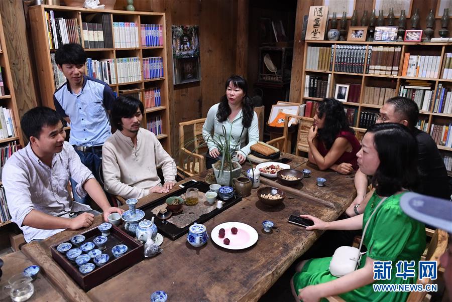 在龙潭村“随喜书屋”,来自江西的曾伟(左二)和其他几位定居龙潭村的“新村民”喝茶聊天(6月11日摄)。2017年8月,曾伟跟随文创团队到龙潭村考察,随后他便租下一幢即将坍塌的老宅改造成书屋,从事网络图书经营,顺便将龙潭的特产介绍给外地的朋友。 新华社记者 姜克红 摄