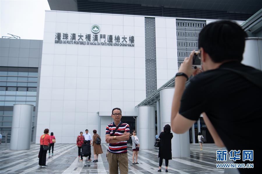 10月24日,市民在港珠澳大桥澳门边检大楼外拍照留念。