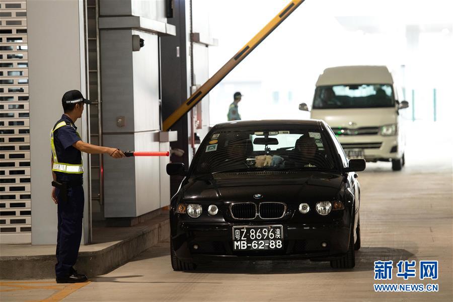 10月24日,首辆私家车在澳门口岸离境车道上通关。 新华社记者张金加摄