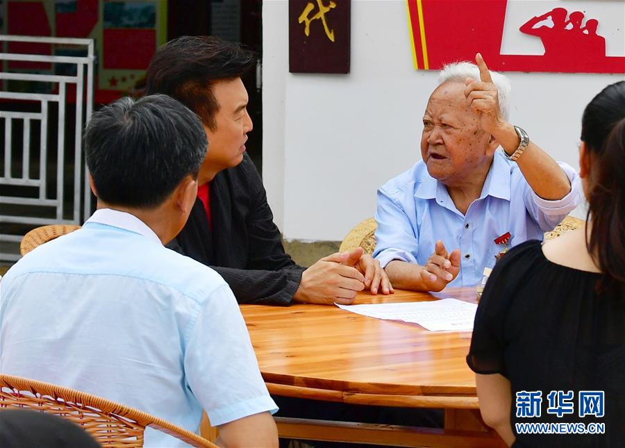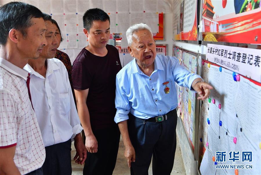 6月16日,在福建省长汀县南山镇长窠头村的家中,钟宜龙老人(右一)在讲述整理烈士名单的故事。新华社记者 魏培全摄