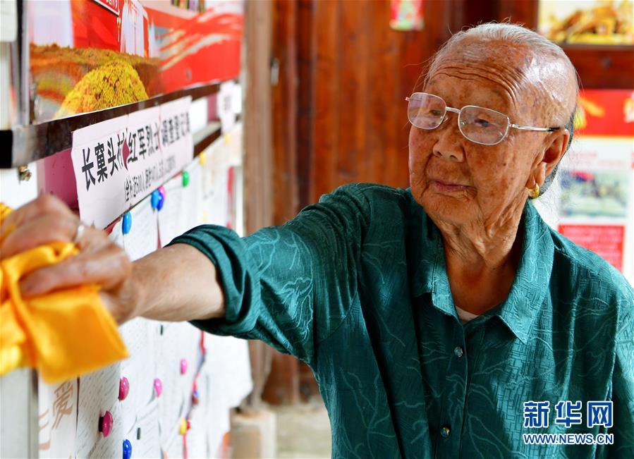 6月16日,在福建省长汀县南山镇长窠头村的家中,钟宜龙94岁高龄的老伴涂成秀在擦拭展板。新华社记者魏培全摄