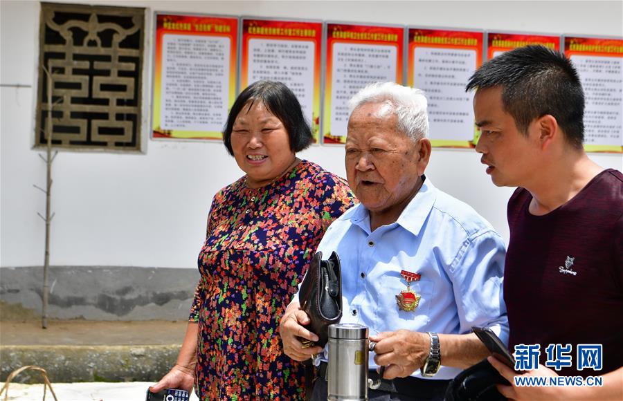 6月16日,在福建省长汀县南山镇长窠头村,钟宜龙老人的儿媳扶着他走出房门。新华社记者 魏培全 摄