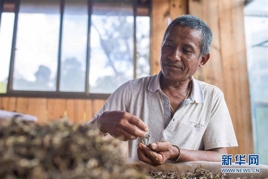 6月13日,布朗山布朗族乡老曼峨村村民玉先南在采摘古树茶。新华社记者 胡超 摄