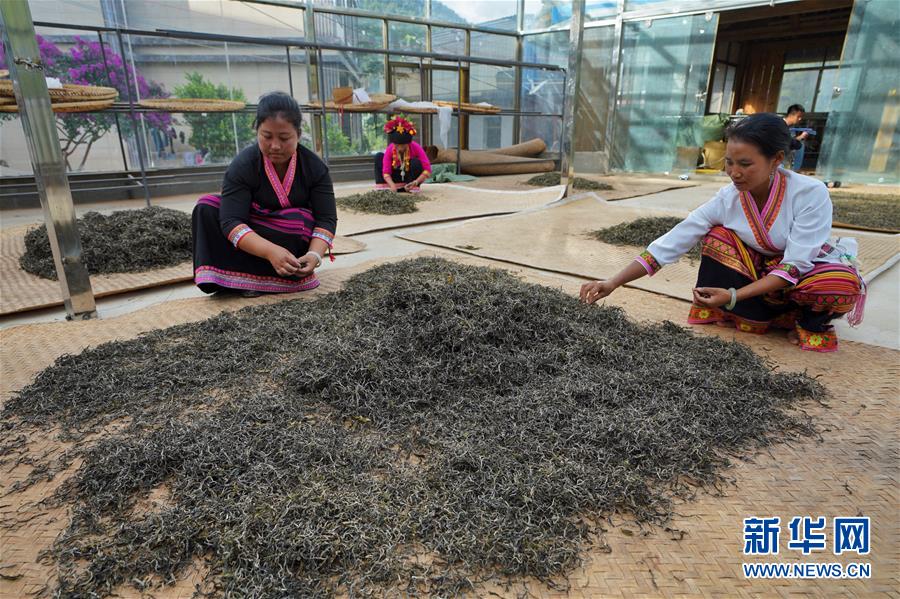 6月13日,布朗山布朗族乡老曼峨村村民把茶树鲜叶进行萎凋处理。新华社记者 秦晴 摄