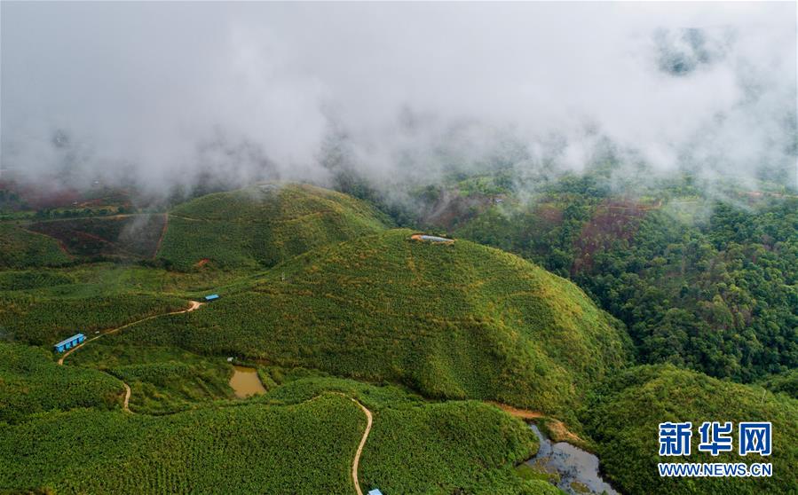 6月13日无人机拍摄的云雾缭绕的布朗山布朗族乡的一处茶山。新华社记者 秦晴 摄