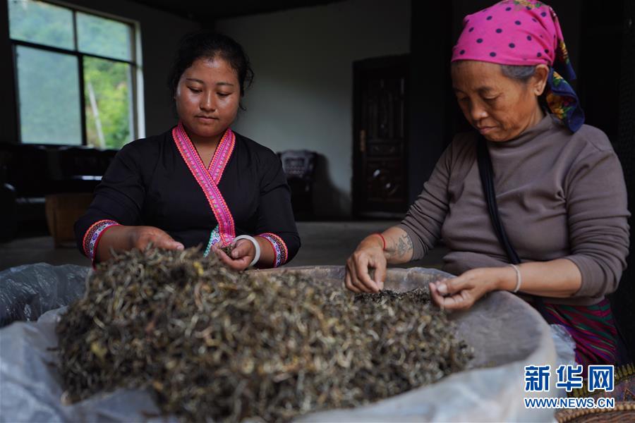 6月13日,布朗山布朗族乡老曼峨村村民玉儿安(左)和母亲在村里的茶叶初制厂挑拣茶叶。新华社记者 秦晴 摄