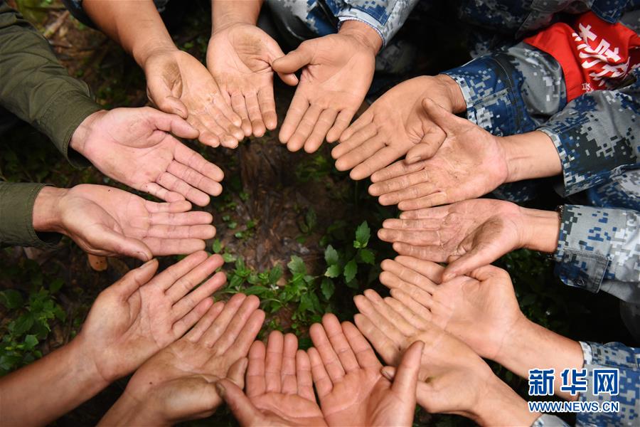 春蕾林场的护林员们在展示巡山归来的手(6月13日摄)。新华社记者杨文斌摄