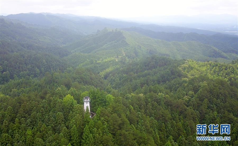 这是6月13日无人机拍摄的春蕾林场瞭望塔和林区。新华社记者杨文斌摄