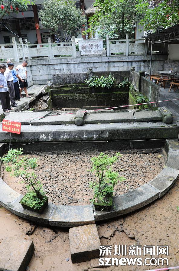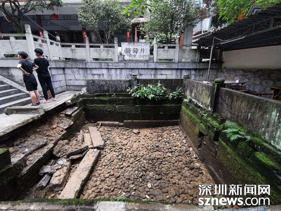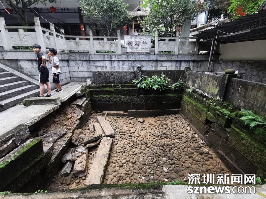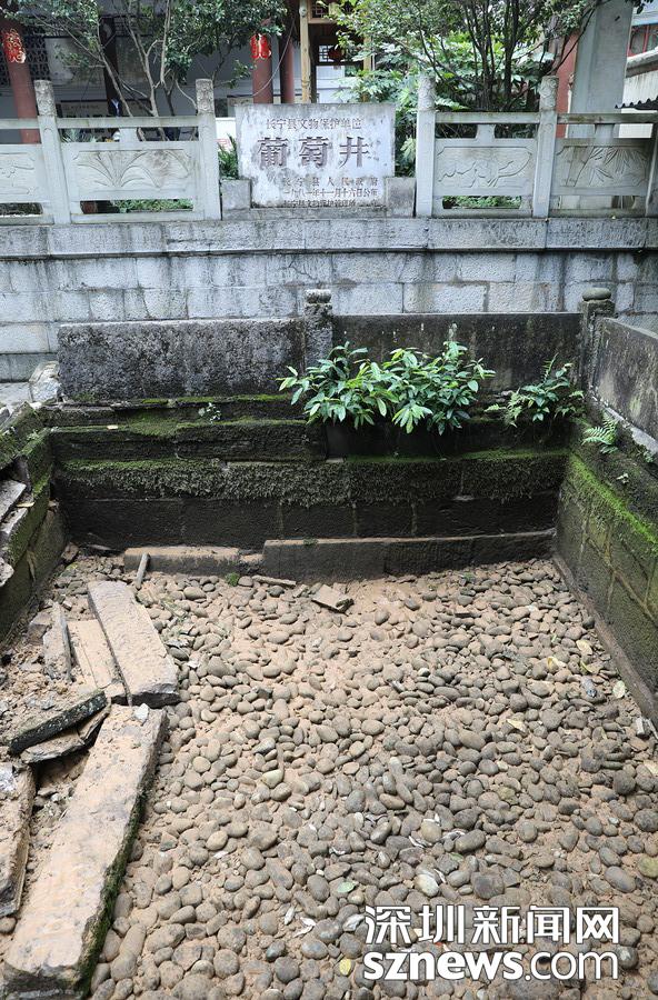 葡萄井四周护栏已经被震坏,原本清澈的井水也只见黄泥。在震前,井中不仅有数条金鱼,还有一条鲟鱼,由于井水干涸,鲟鱼和金鱼已经死亡。
