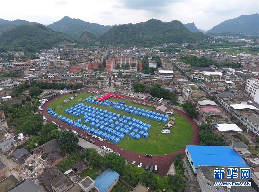 6月18日无人机拍摄的设在长宁县双河中学运动场上的临时安置点。 截至6月18日15时30分,四川长宁地震因灾死亡13人,受伤199人。目前,受灾群众得到妥善安置,受伤群众得到精心救治。 新华社记者 刘坤 摄
