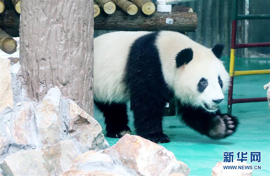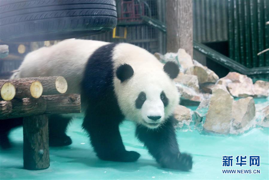 6月18日,大熊猫“星光”走在馆内水池边的石头上。 当日,来自四川的大熊猫兄弟“和风”与“星光”飞抵上海,正式开始了在上海动物园为期三年的生活。为迎接这对“风光兄弟”,上海动物园将原有的大熊猫馆扩建并装修一新,空调、水池、游乐场以及竹叶储存间等配置齐全。 新华社记者 方喆 摄