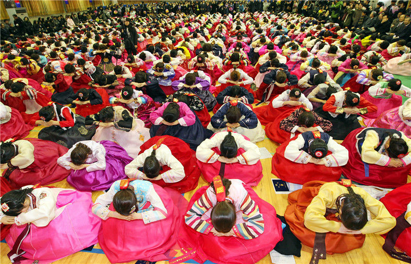 2011年2月10日,韩国首尔,女子高中毕业生身着传统韩服参加毕业典礼及成年礼。
