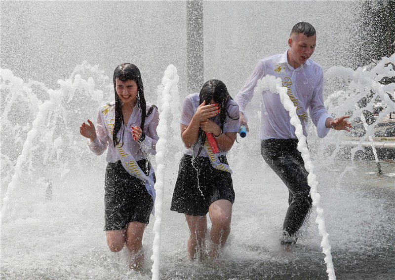 当地时间2019年5月31日,乌克兰基辅,当地中学毕业生在喷泉中玩耍,庆祝顺利毕业。