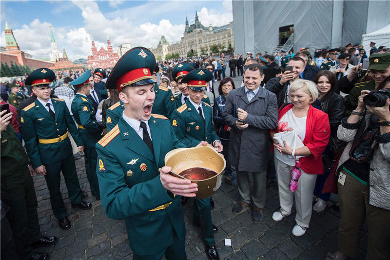 当地时间2017年6月23日,俄罗斯莫斯科,莫斯科军事指挥官培训学校毕业典礼在红场举行,学员喝倒在钢盔中的酒。
