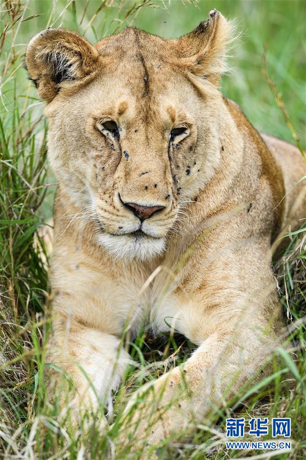 6月17日,在肯尼亚马赛马拉国家保护区,一头狮子在草丛中休息。 新华社记者 李琰 摄