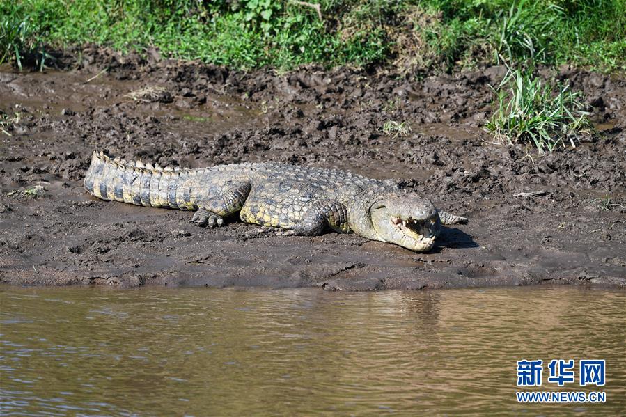6月17日,在肯尼亚马赛马拉国家保护区,一条鳄鱼在水边休息。 新华社记者 李琰 摄