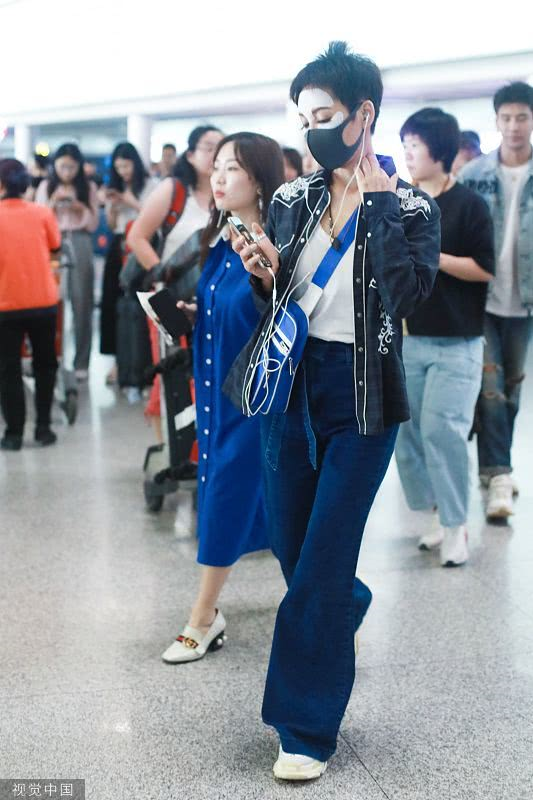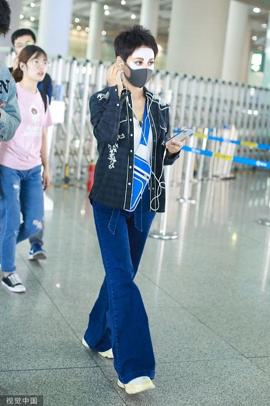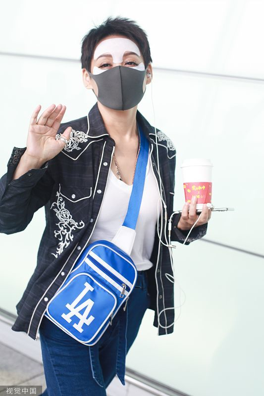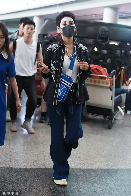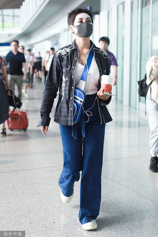2019年6月19日,北京,宁静现身机场。她穿敷面膜亮相短发干练个性洒脱,戴口罩对镜挥手大方任拍。