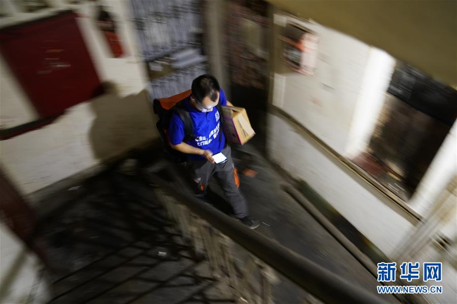 6月19日,幸银银在白象居小区旁的一栋老式楼房内爬楼去收取快递包裹。 新华社记者 刘潺 摄
