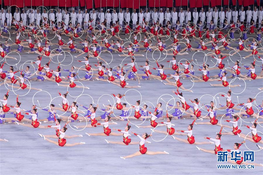 6月20日晚,中共中央总书记、国家主席习近平和夫人彭丽媛在朝鲜劳动党委员长、国务委员会委员长金正恩和夫人李雪主陪同下,在平壤“五一”体育场同朝鲜各界群众一道观看大型团体操和艺术演出。 这台演出是为习近平此次对朝鲜进行国事访问专门精心创作的,数万名朝鲜演员参加表演。演出在绚丽的焰火中拉开序幕。朝鲜三大乐团,国立交响乐团、功勋合唱团、三池渊管弦乐团首次同台献艺。整场演出气势恢宏,震撼感人。 新华社记者申宏摄