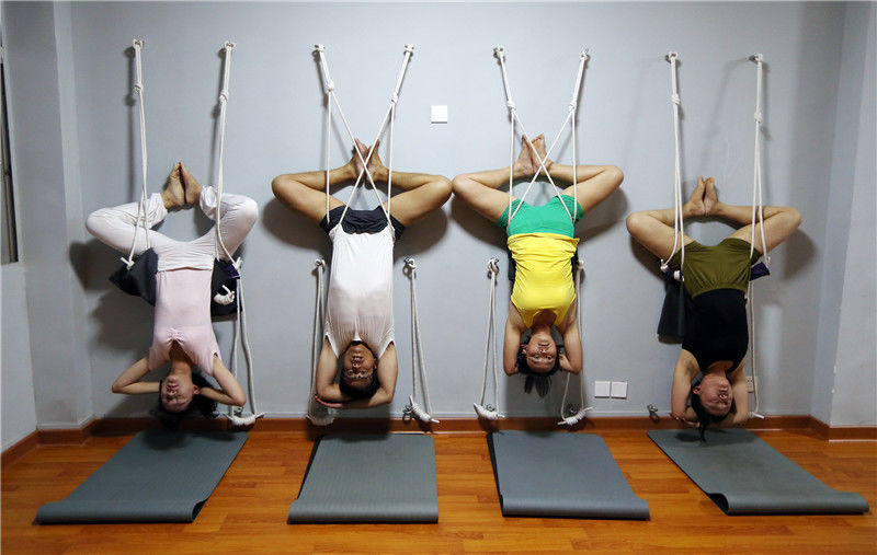 2014年8月6日,福建泉州,一家瑜伽健身馆内,几名年轻人正在墙壁上练习瑜伽“艾扬格”头倒顶动作。