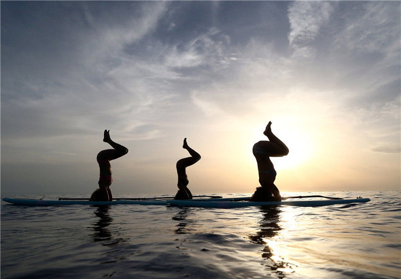当地时间2017年7月10日,克罗地亚亚得里亚海岸,当地民众在海上冲浪板练习瑜伽。