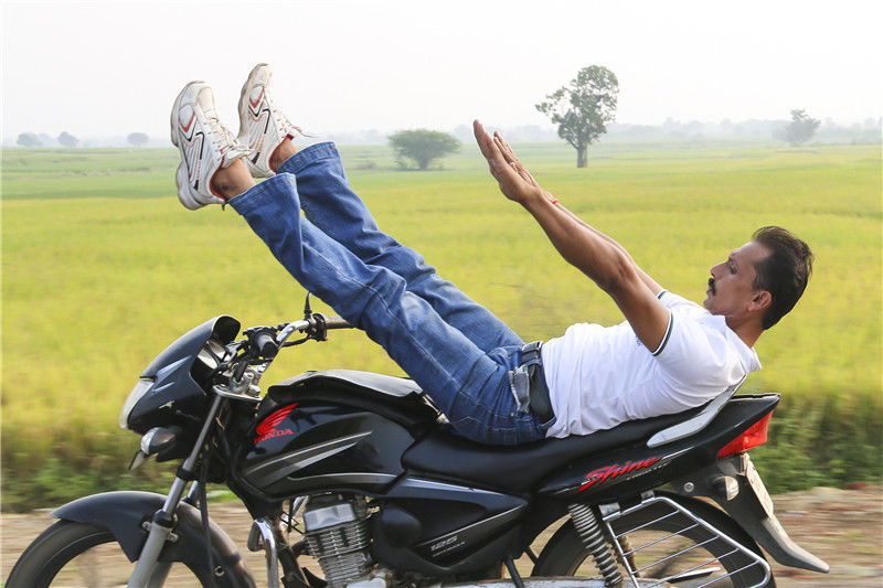 当地时间2014年11月24日,印度泰伦加纳,当地一名40岁的男子挑战极限,在行驶中的摩托车上做瑜伽。
