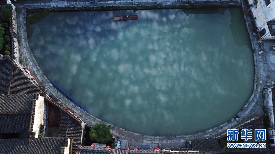 这是安徽黟县宏村风景区月沼景点的清晨景象(6月23日无人机拍摄)。
