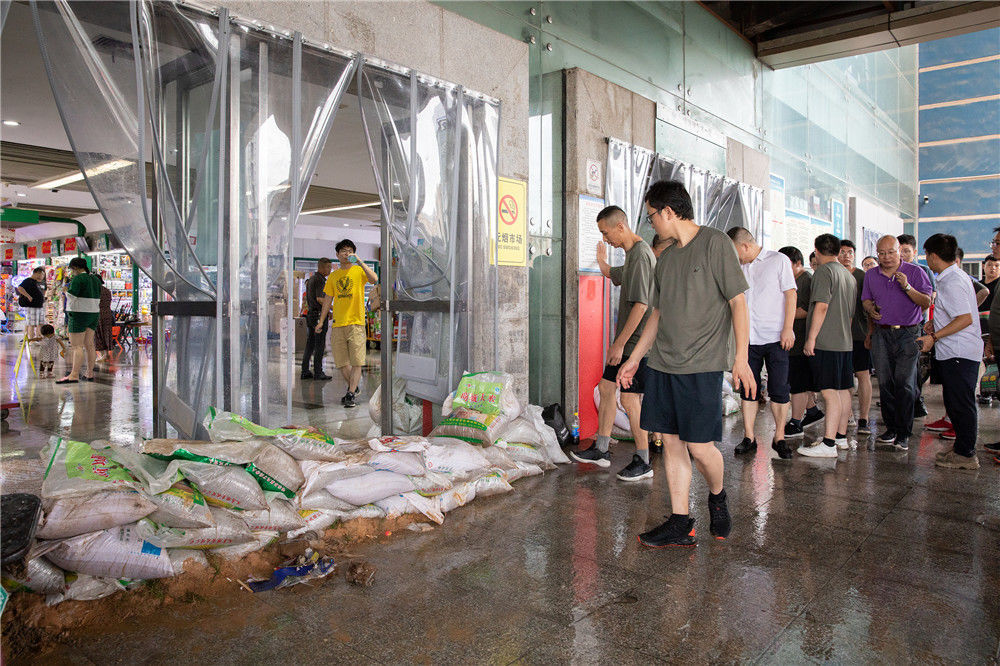 2019年6月21日,浙江金华,义乌福田市场一区一楼商铺,入口处垒起沙袋防水。