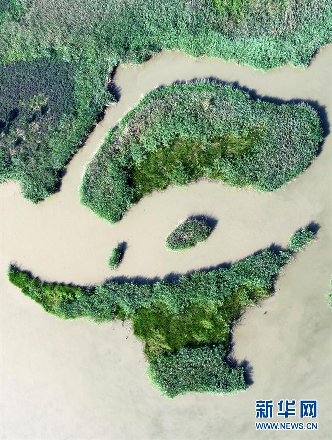这是天津市宁河区七里海湿地内芦苇和水面形成的图案(6月22日无人机拍摄)。