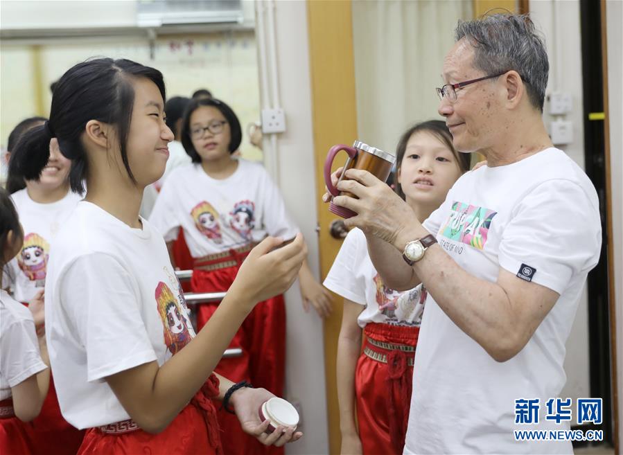 一群孩子和79岁的粤剧名伶杨剑华在一起(6月8日摄)。 声辉粤剧推广协会成立于2003年,是香港重要粤剧艺术团体之一,致力于向青少年推广粤剧。协会目前有两个初班,3个中班,一个青少年班。粤剧又称“广东大戏”,表演技艺包括“唱做念打”,即唱功、身段、台词、武打,主要流行于广东、广西和香港、澳门等地区。2009年,粤剧被列入联合国教科文组织人类非物质文化遗产代表作名录,今年正逢十周年。 新华社记者 吴晓初 摄