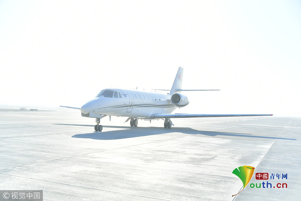 奖状680校验飞机平稳地降落在北京大兴国际机场西一跑道上。视觉中国