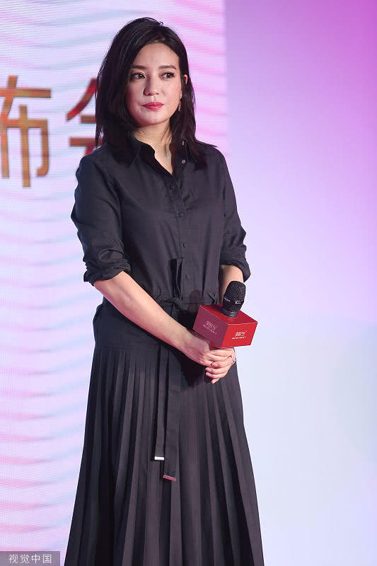 赵薇一身黑色长裙现身发布会现场,化着淡妆的她看起来气色不错。赵薇的脸颊圆润,看起来比影视剧中胖了不少。
