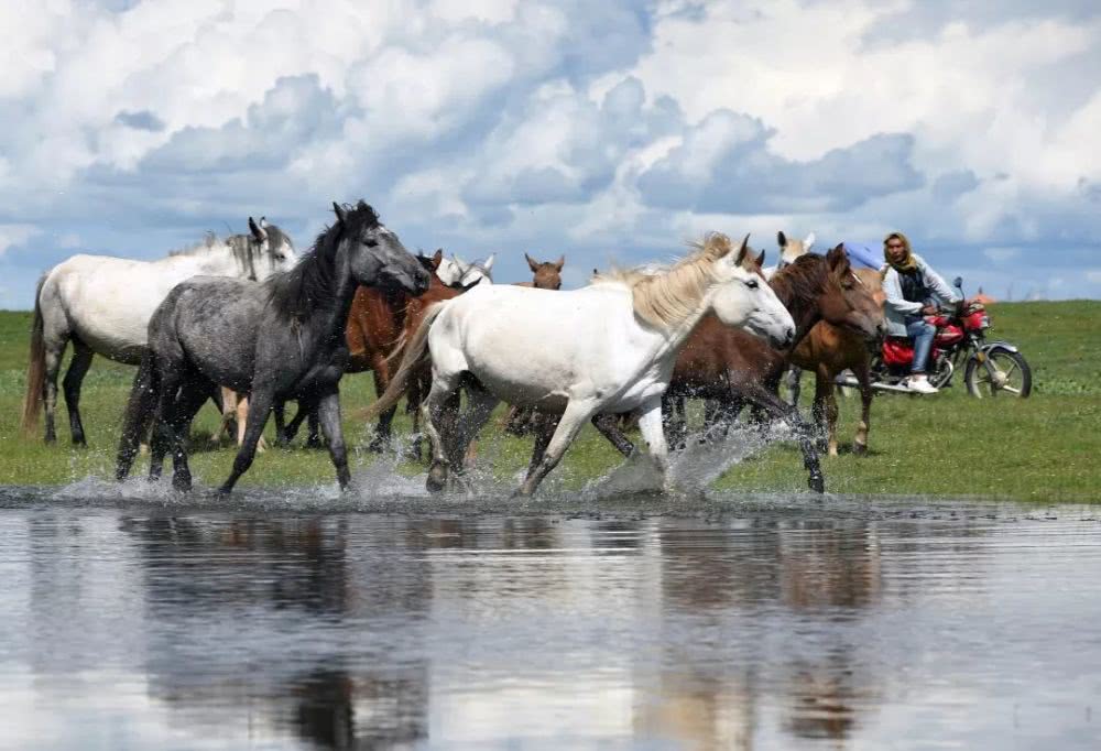 6月22日,在玛曲县河曲马场,马场工作人员在照看一群河曲马。新华社记者马宁摄