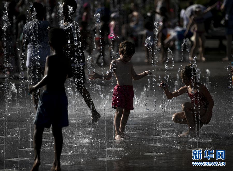 6月29日,在英国伦敦,孩子们在广场喷泉戏水纳凉。